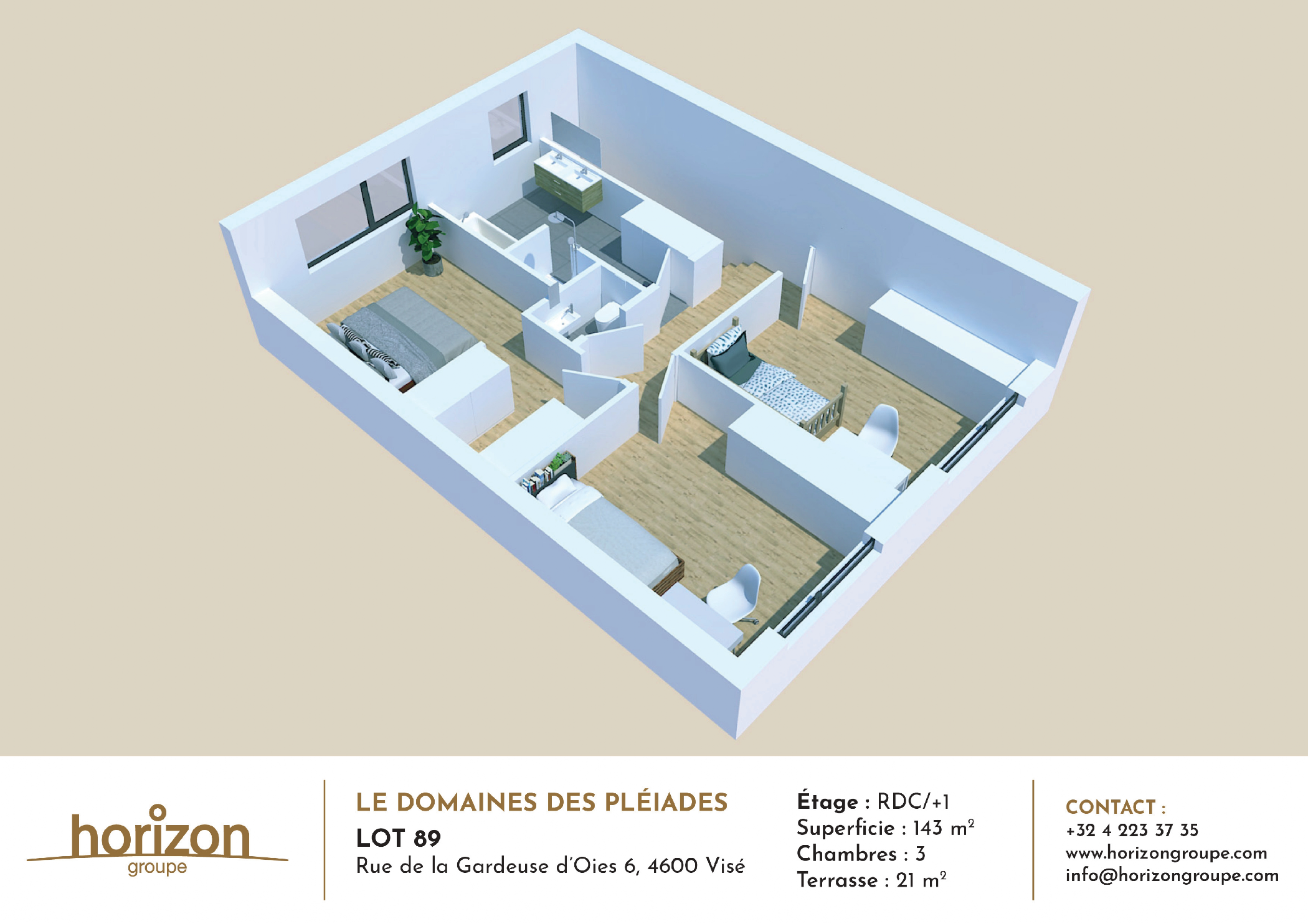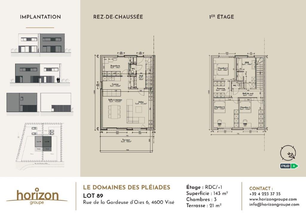 Belle maison 3 façades contemporaine à réaliser de 143 m² située au cœur du Domaine des Pléiades (Visé) qui est le 1er éco-quartier avec réseau de chaleur biomasse de Belgique. Il met l’accent sur la qualité d’environnement : une large place est réservée à la végétation, avec de nombreuses allées pédestres et une aire de jeux ce qui en fait un quartier résidentiel convivial et agréable à vivre. La maison est composée d’un hall d’entrée avec wc séparé, d’un spacieux séjour ouvert sur la cuisine donnant accès de plain-pied à la terrasse et au jardin . A l’étage, un hall de nuit dessert 3 chambres à coucher dont une avec dressing, une salle de bains équipée